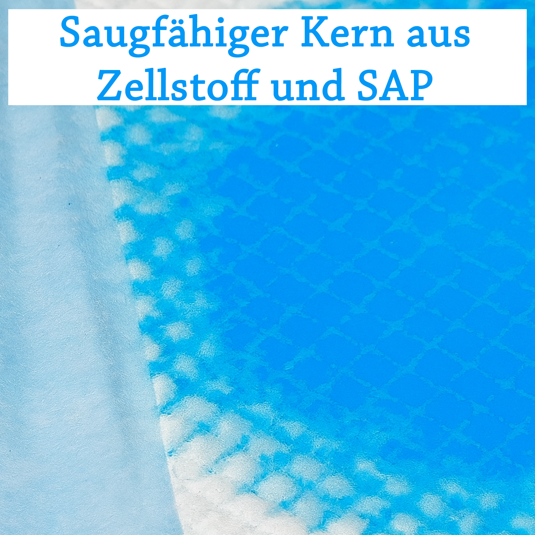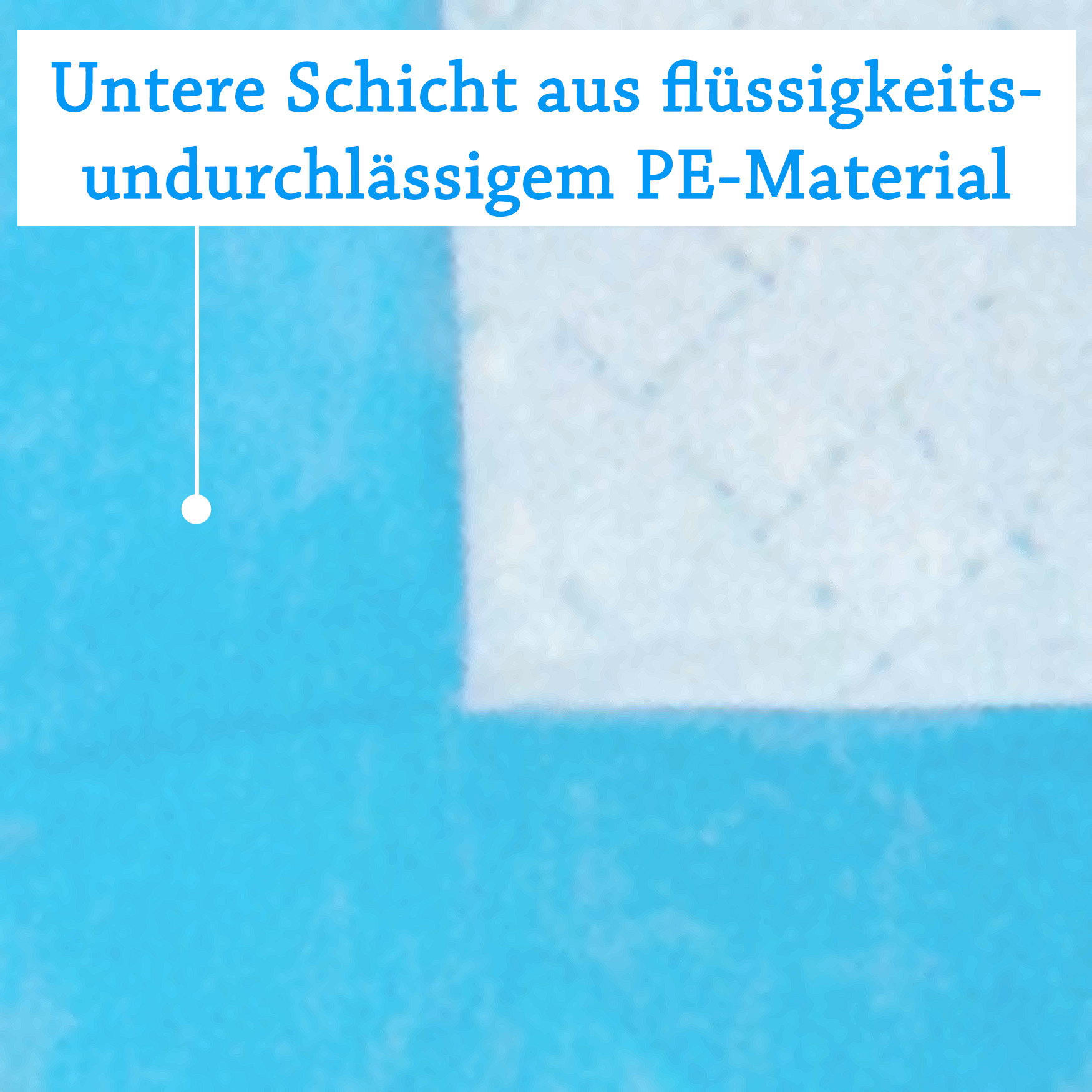 - 6-lagiger Schutz: Vliesstoff – Zellstoff-Flocken – Superabsorbierendes Polymer (SAP) – PE-Folie; in mehreren Schichten vereint